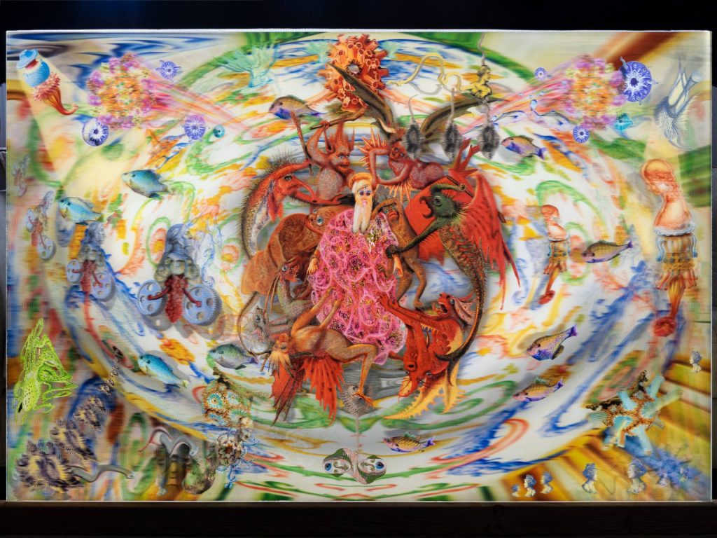 Miss Mito, by Einar and Jamex De La Torre, is inspired by Dr. Gerald Shadel’s work on mitochondria and their role in aging. It is a lenticular print presenting a dual image of a doll-like beauty queen when viewed from one end, and a white haired man swarmed by baroque demons when viewed from the other. It represents the dual nature of mitochondria, which is a vital force of energy for us at the cellular level, but may become destructive and disease-bearing as our cells age.