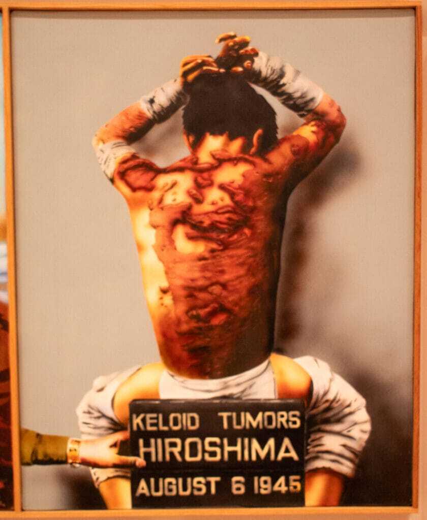 The impact of nuclear explosions can be devastating, as shown in artist Ben Sakoguchi’s “Bombs, 1983” series. The work is comprised of 24 panels recreating photo documentation of atomic bomb tests, nuclear-armed ballistic missiles and aircraft, and keloid tumors and flash burns on survivors of the United States bombings of Hiroshima and Nagasaki, which killed hundreds of thousands of Japanese civilians.