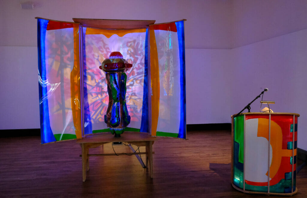 Responding to the peaceful setting, a group of visitors sat down on the bolstered benches built by Kling for this purpose, to take it all in. As if the colorful windows, casting red and blue reflections onto the wooden floor, weren’t enough, there is also a triptych altarpiece, with a rotating central sculpture, a painted lectern, and painted hanging lamps. Wendell, a graduate from UCSD’s visual arts program, and a professor at Mesa College, admits to being a maximalist, who likes to add more and more elements to his installations.