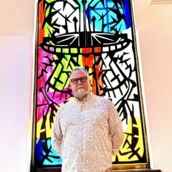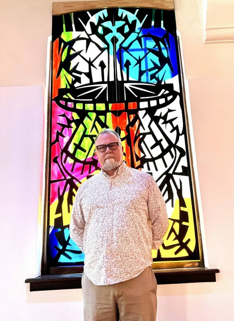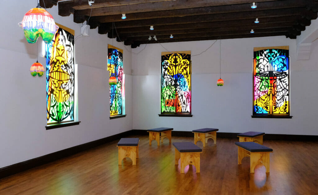 Walking into the Athenaeum’s current exhibition is like stepping into the hushed, calm atmosphere of a cathedral, illuminated by jewel-tone stained-glass windows. The artist Wendell Kling was inspired by European cathedrals like Chartres Cathedral in France and Ulm Minster in Germany, but also by chapels created by artists like Matisse and Rothko, or the Quaker meeting hall by James Turrell – spaces where art and contemplation intersect.