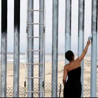 Claudia Cano uses public performance by dressing up as a house-keeper/cleaning lady named Rosa Hernandez. Clad in a pink maid’s uniform, apron, and wig, Cano sweeps public spaces including a park, museum and adjacent to the border wall, demonstrating through photographs her invisibility to oblivious onlookers, and highlighting the importance of immigrant workers to our economy. Ana Teresa Fernandez’s video projection Borrando la Frontera shows the artist in a cocktail dress and high heels, climbing ladders as she attempts to paint the border fence in Playa de Tijuana a light powder blue creating an illusion of a disappearing border fence.
