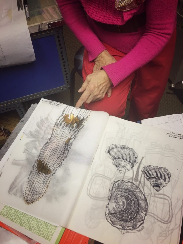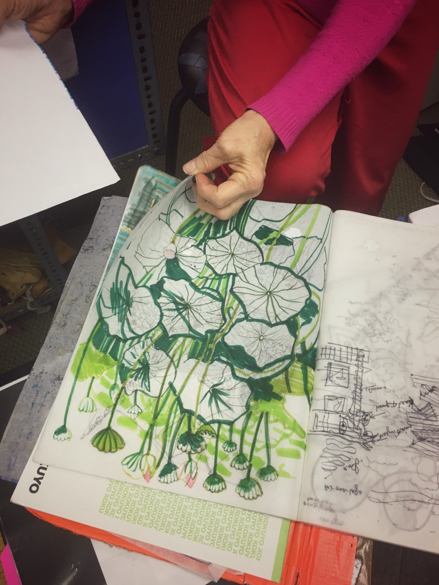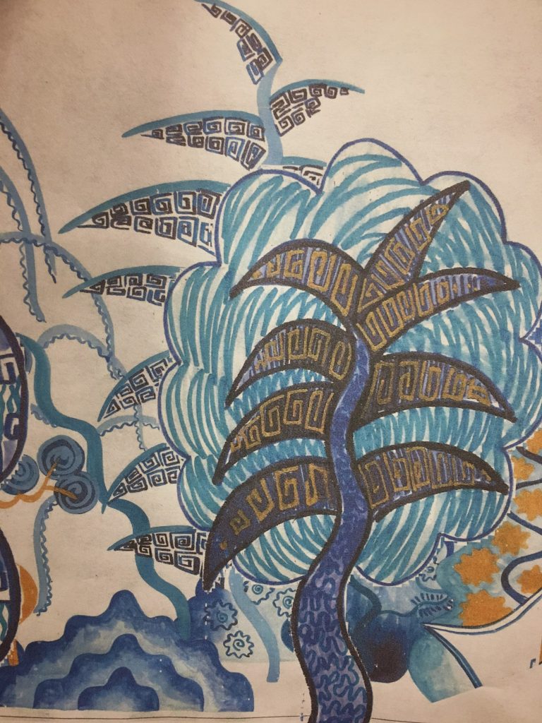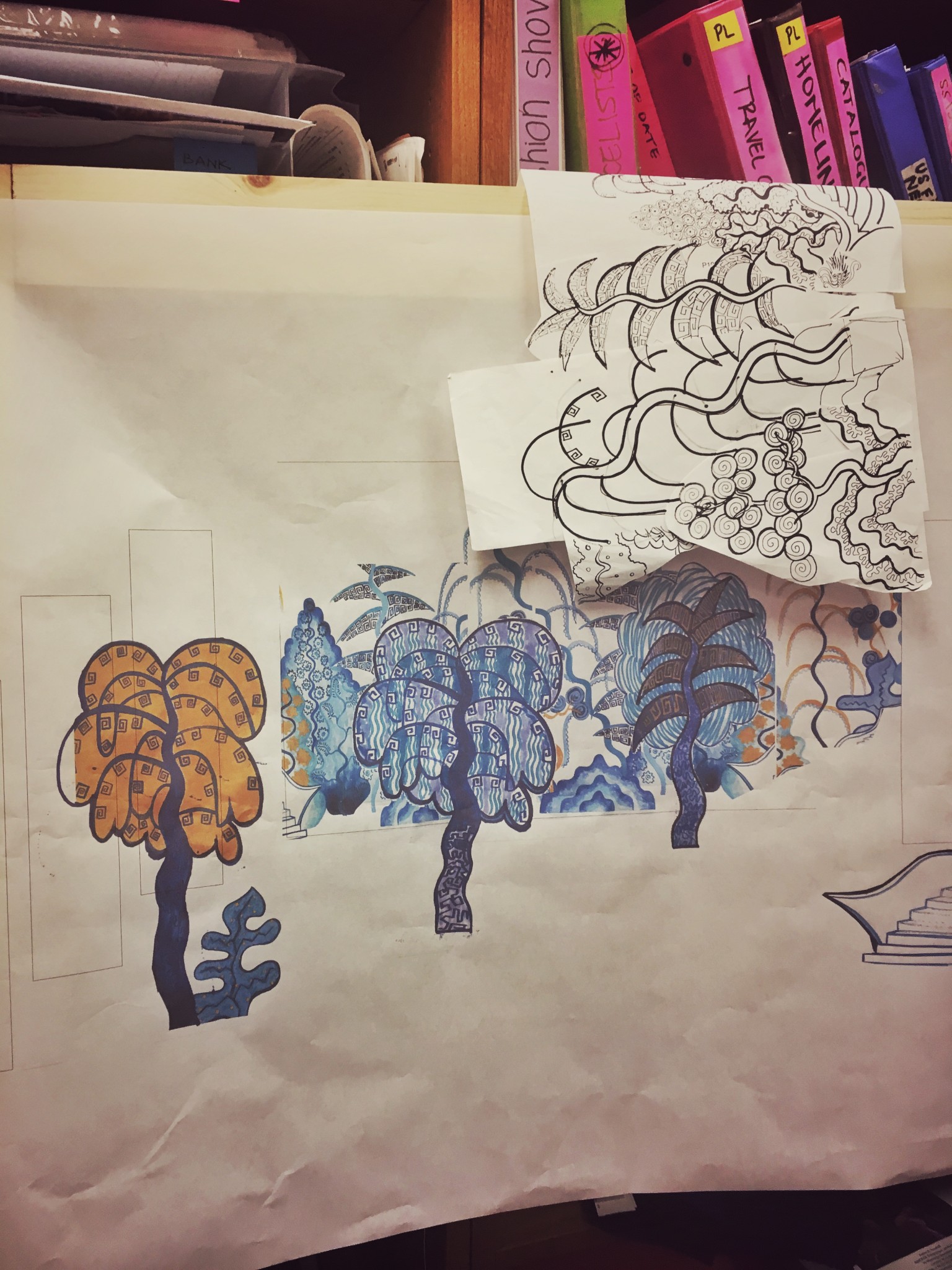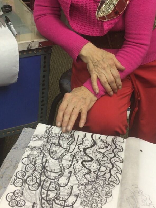 Leafing through the pages of an oversized sketchbook, she slipped a white sheet behind its near-transparent rice paper to revealing her drawings to full effect. “These sketches are from willow pattern plates, so I can make designs for the magic trees for the opera.”A tangle of whimsical patterns filled the page in a chinoiserie flattened and geometric style, alluding to the designs onblue-and-white willow pattern plates that date back to the late 1700’s. She told me she bought her first rice-paper sketchbook in 1971 and has drawn in them ever since. “So much can happen, I love the feel…the pen flows.” She turned the page revealing layers of disk-shaped leaves. “Here I visited Lotus Land—you never know what you’re going to find!” she exclaimed, adding that she never knows what will inspire a pattern for the fabric she designs for her fashion collections. She turned the page. “In this one, I was on the Queen Mary 2,” a transatlantic ocean liner: “I’d get up at 4 AM to draw…here is the statue of Liberty…” She pauses; a faraway smile suffuses her face with warmth, and I see she’s remembering something fondly. As she turned the pages, she slipped a plain piece of paper between the thin sheets to allow the drawing to take shape from the clutter of marks visible through several translucent sheets. Her love of nature is apparent in the delight she takes in sharing her drawings. “Here is a cactus—it was beautiful!”