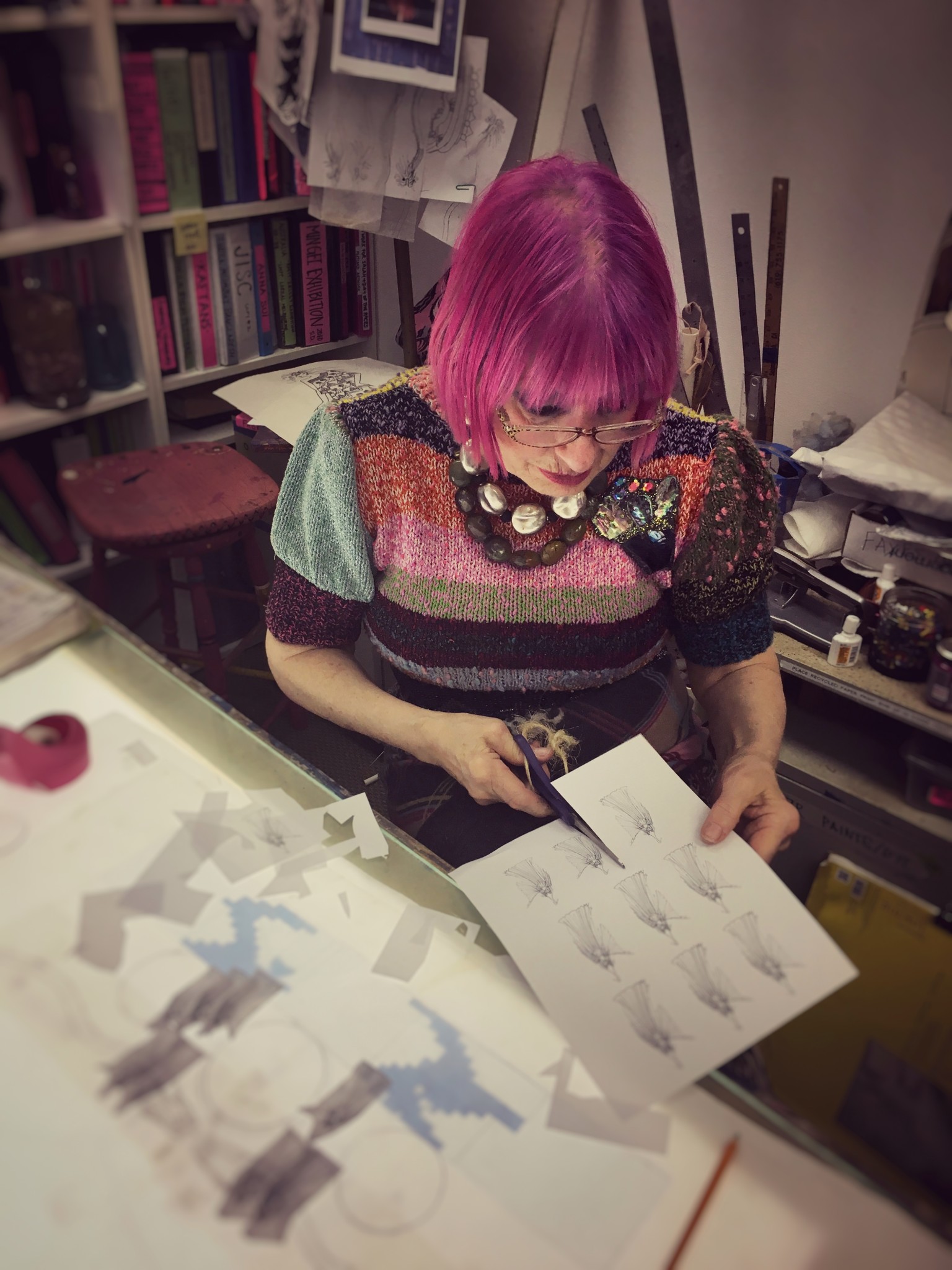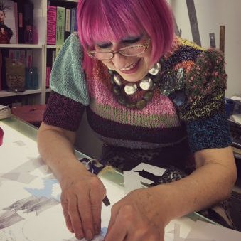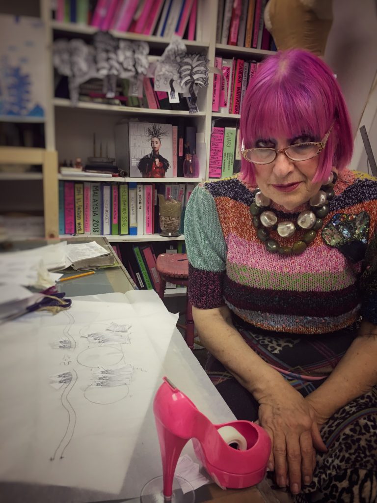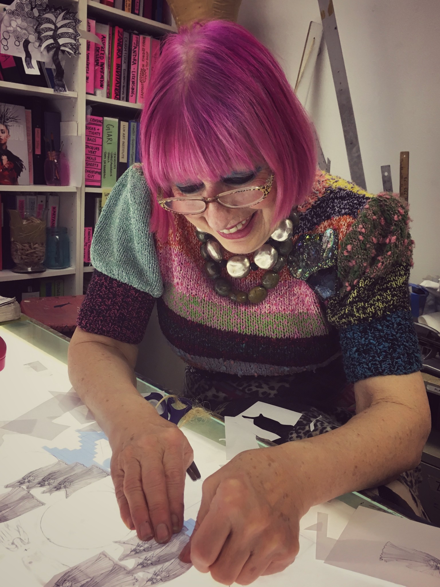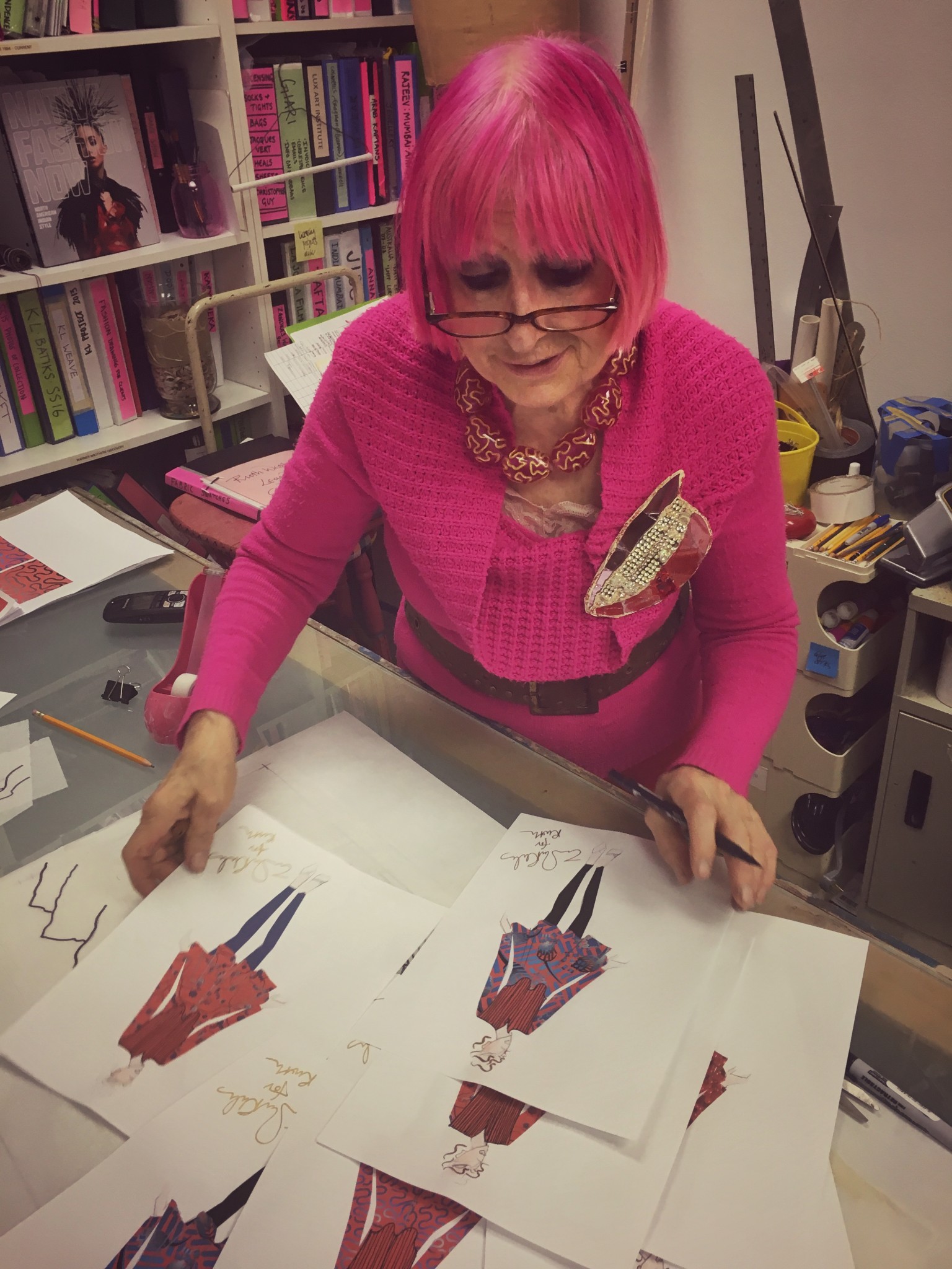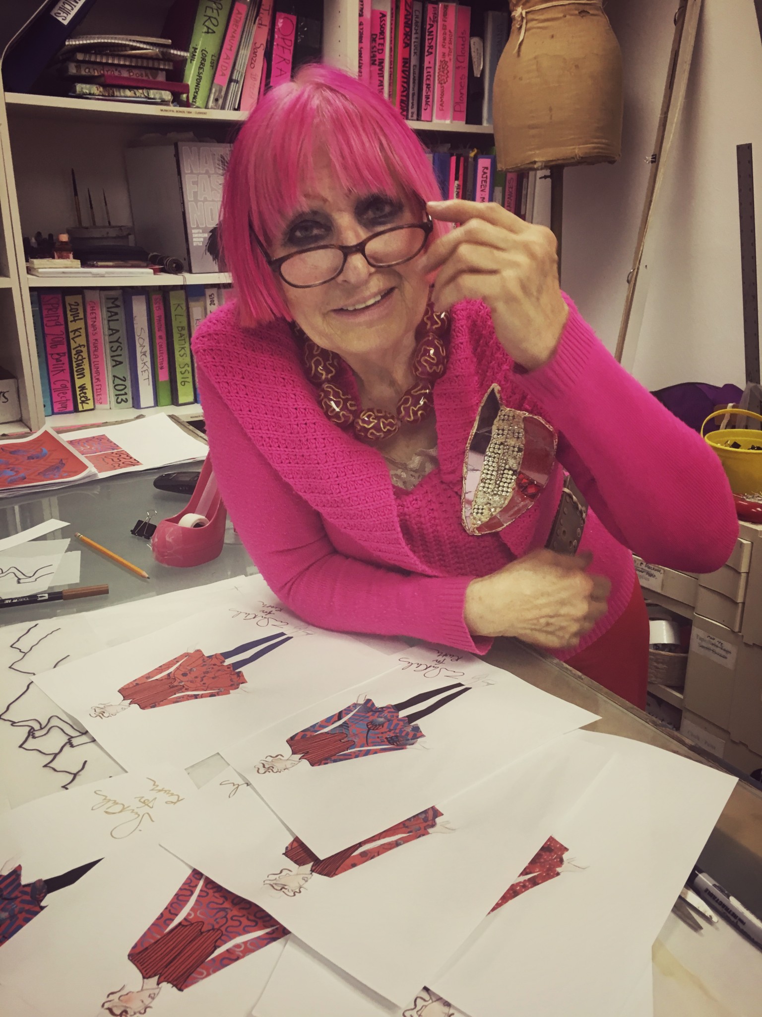 Zandra Rhodes greeted me warmly with her legendary hot pink hair and theatrical turquoise eye makeup. I ended up visiting her studio twice because, despite her warm and engaging personality, I had surprised myself by getting star struck and needed a second visit to flesh things out. Lucky for me, she had graciously invited me back—suspecting, I think, what had happened—in case I “needed more info.” It was thrilling to be invited back by this iconic British fashion designer who started her career in the 60’s, designing for the likes of Princess Di, Elizabeth Taylor and Freddy Mercury. Besides creating her fashion collections, she has designed sets and costumes for several operas, founded London’s Fashion and Textile Museum, and has been given the honor of “Dame Commander of the Order of the British Empire”—the female equivalent of being knighted—for her work promoting British fashion and textiles. She is known for her bold and feminine fashion collections and her dramatic use of color.