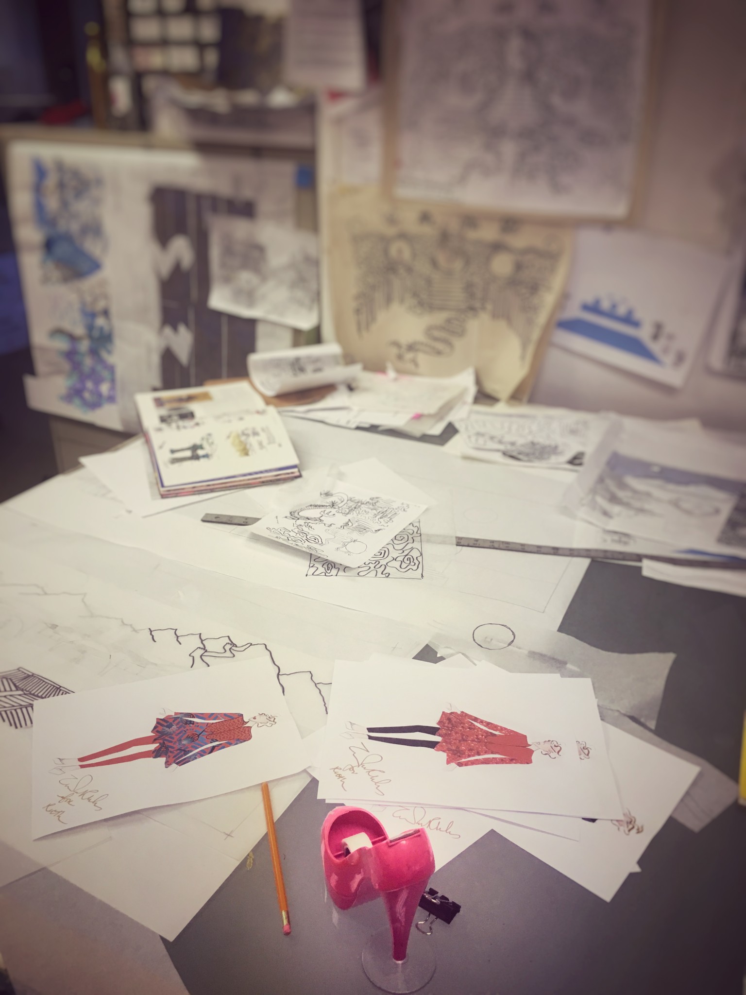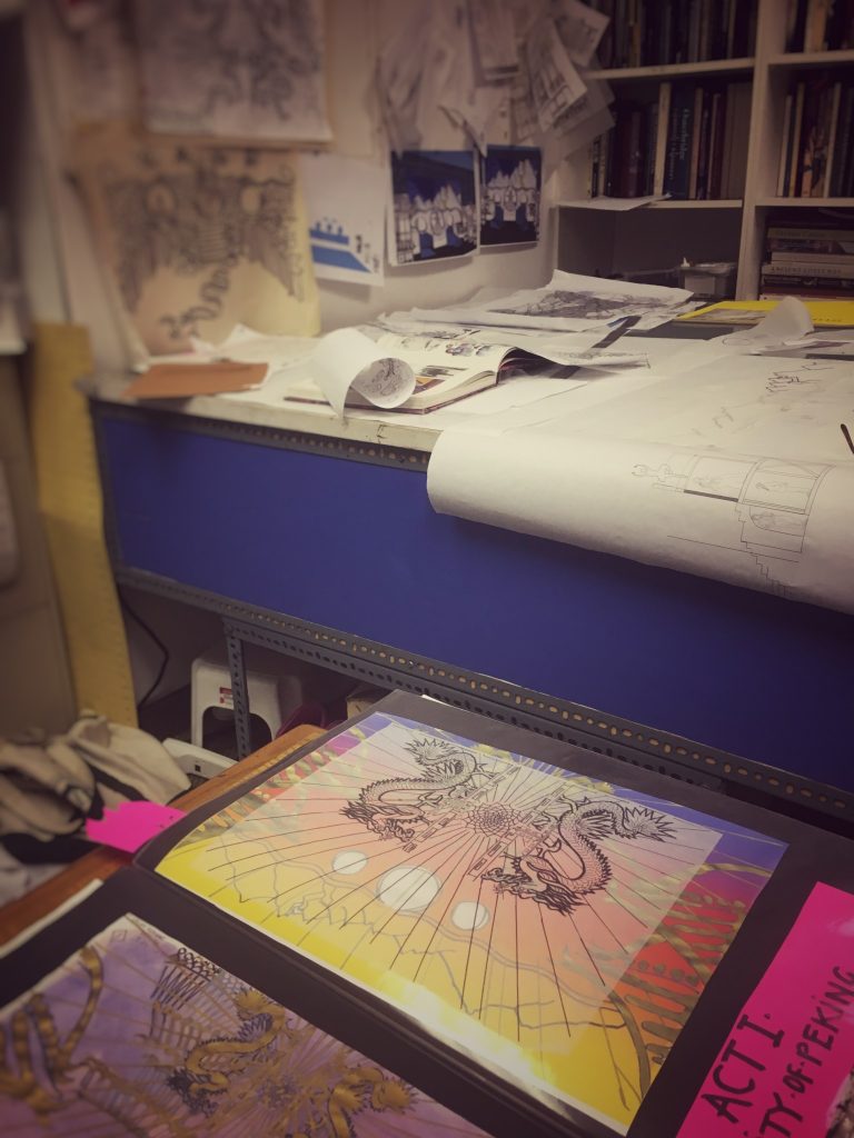 All around her studio were drawings of Asian-inspired patterns and designs tacked to the walls and bookshelves. Pointing to a swirl of bold black lines pinned to the wall, she told me these are stage designs for the San Diego Opera. She is in the middle of designing the set and costumes for their 2018 production of Puccini’s Turandot. I started to snap a photo, and then asked her if I should even be taking photographs? She paused and said in her sing-song yet staccato British accent said that photos were ok, just not too specific. “There has got to be a surprise! Otherwise, there’s no reason for them to show up.”