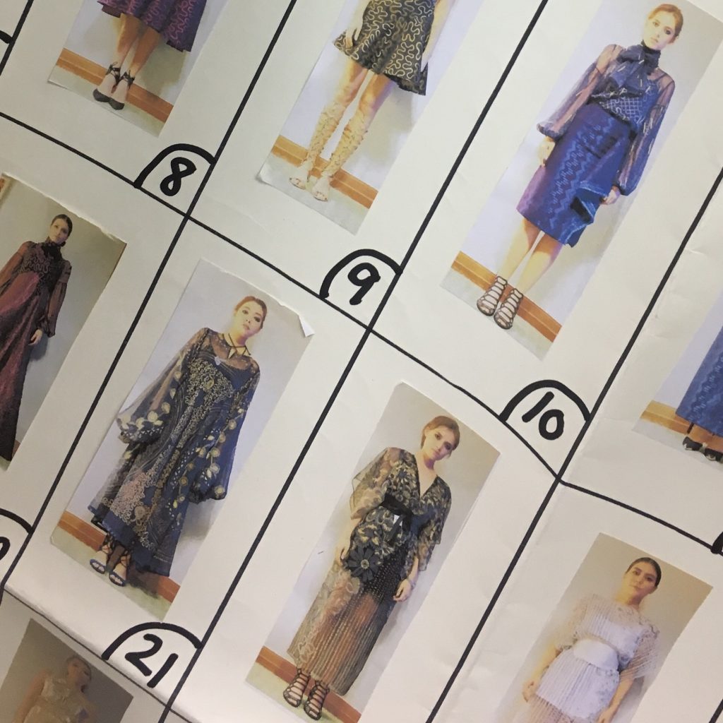 She takes out a bare razor blade from a pouch, grayed from handling, and sharpens her pencil. “It gives you a much better point.” As we chat she cuts out multiple little, xeroxed figure drawings and tapes them to the tracing paper, slitting holes in different places to tuck in the figures or cutting them off where they would not be visible on stage. I’m struck by her love of all ways analog, right down to how she sharpens her pencil. She had been up until 1 AM on a call to her London studio directing a special order, and then up again at 6 AM to make sure everything was turning out the way she wanted. Yet here she was, bright-eyed, to meet me at 10 AM. The zest with which she approaches creating her fashion collections, directing her fashion shows, stage design, and her monthly trans-Atlantic flights, makes me wonder if her hands-on approach to life makes more sense than the unrestrained cell phone use and complete reliance on technology of our modern world. At almost 80 she is a force to be reckoned with. And not a computer in sight!